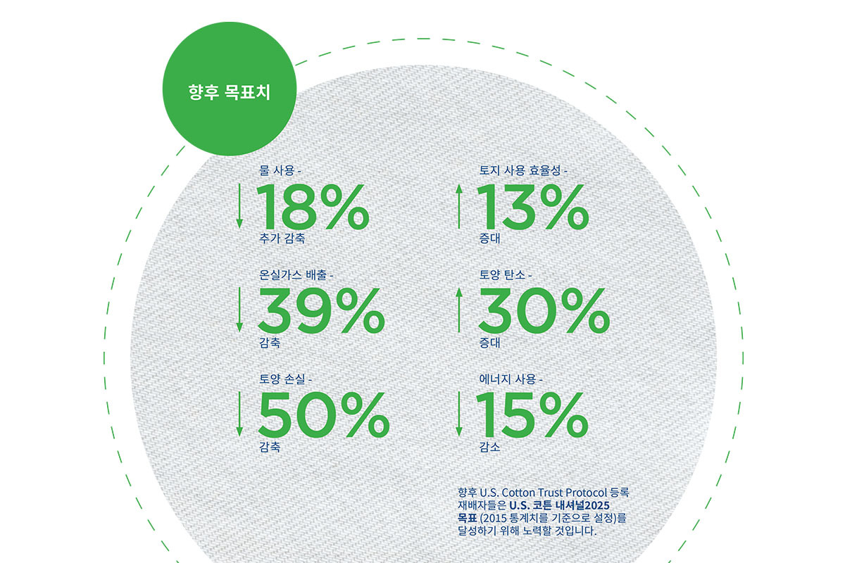 미국의 코튼업계는 환경 영향에 대한 원대한 목표를 갖고 있으며 트러스트 프로토콜은 이 목표를 보다 성공적으로 달성하도록 돕는 하나의 길을 제공합니다. 지속적 향상을 촉진하기 위해 트러스트 프로토콜이 사용하는 6가지 지표에는 토지 사용, 토양 보존, 에너지 사용, 온실가스 배출, 토양 탄소, 관개용수 사용이 포함되며 이는 미국 코튼업계가 설정한 2025 국가 목표와 일치합니다.